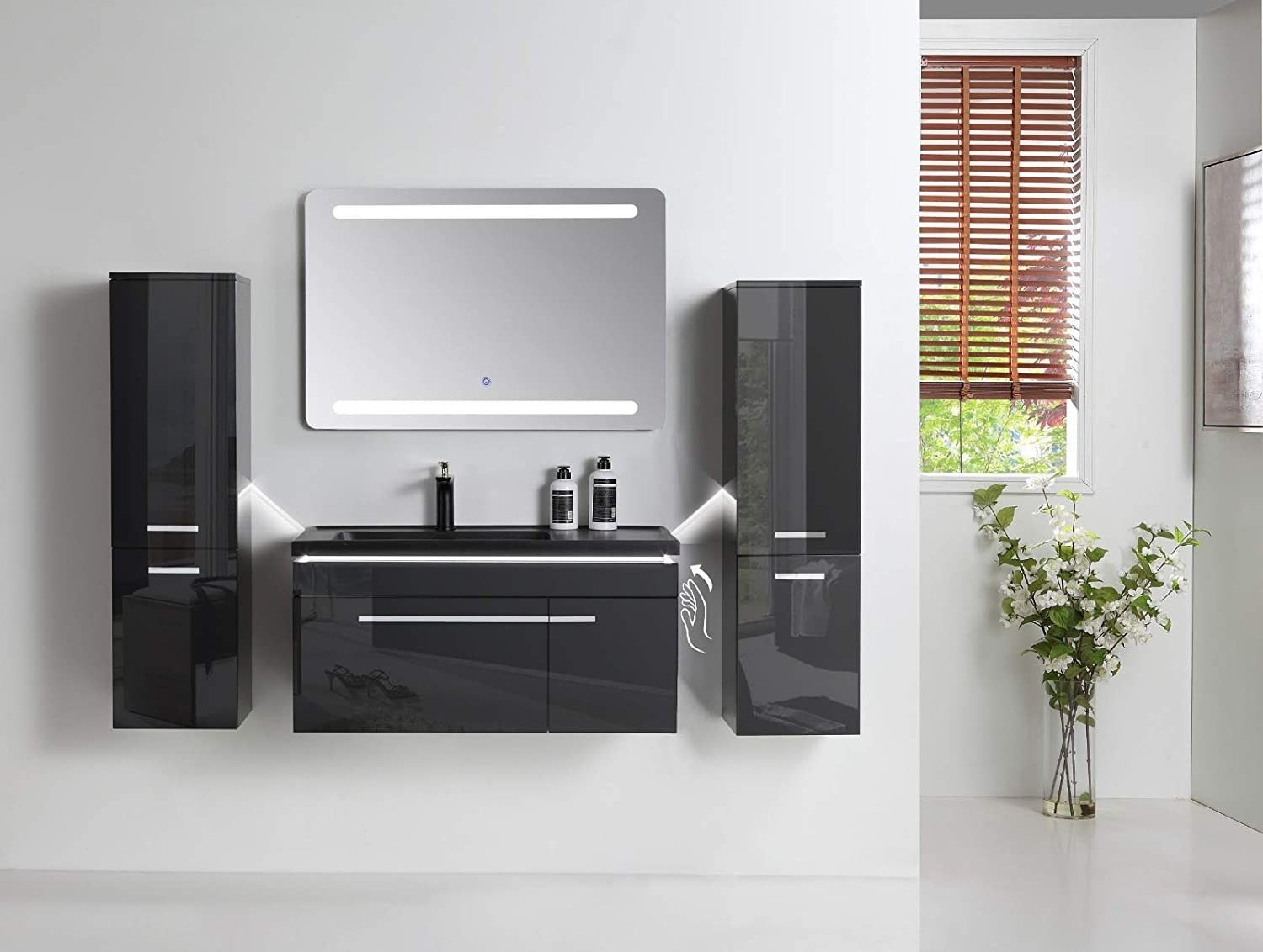 Badmöbel Set 5 Teilig 90 cm Hochglanz Schwarz LED Spiegel Badezimmer Granitbecken