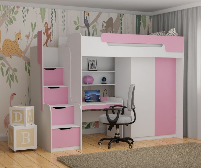 Hochbett DORIAN mit Schreibtisch und Schrank in rosa