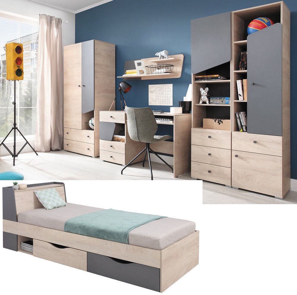 Jugendzimmer Davis Set A Lieferumfang: Zum Jugendzimmer Davis Set A gehören: 1. Schrank 80 2. Regal D4 3. Regal D6 4. Schreibtisch 5. Wandregal 110 Optional bestellbar: 6. Bett 90×200 7. Bett 120×200 Farben: Eiche Anthrazit Material: Laminierte Spanplatte 16mm mit ABS-Kannten Produktdetails: 1. Schr… Mehr