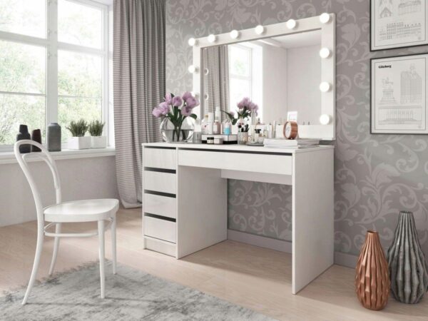 Der schöne Schminktisch ADA wird Ihr Schlaf- oder Ankleidezimmer verschönern. Fünf geräumige Schubladen bieten Platz für alle Make-up-Accessoires und Schmuck. Produktmerkmale: modernes Design * Korpus aus laminierter Platte 16 mm * Fronten aus laminierter Platte 16 mm * 5 geräumige Schubladen ohne Griffe * Schubladen können links oder rechts montiert werden * Rollgleitschienen * ABS-Rand * Farben: Weiß Matt, Weiß Hochglanz, Schwarz Matt * Maße: Länge 120 cm, Breite 55 cm, Höhe 75 cm.