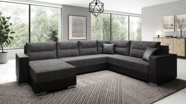 Couchgarnitur CAPTAIN als U Form mit Schlaffunktion und Bettkasten, inkl. abgebildeten Kissen, die Ottomane kann universell links oder rechts montiert werden. In modernem Design, abgesetzte Nähte, doppelte Verbindung von Kunstleder und Stoff, präzise verarbeitet. In diversen Stoffen inkl. allen Kiss… Mehr