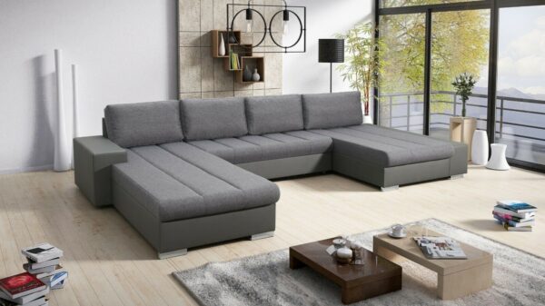 Couchgarnitur VERONA als U Form mit Schlaffunktion und Bettkasten, inkl. abgebildeten Kissen, die Ottomane kann links oder rechts bestellte werden. In modernem Design, abgesetzte Nähte, doppelte Verbindung von Kunstleder und Stoff, präzise verarbeitet. In diversen Stoffen inkl. allen Kissen wie auf … Mehr