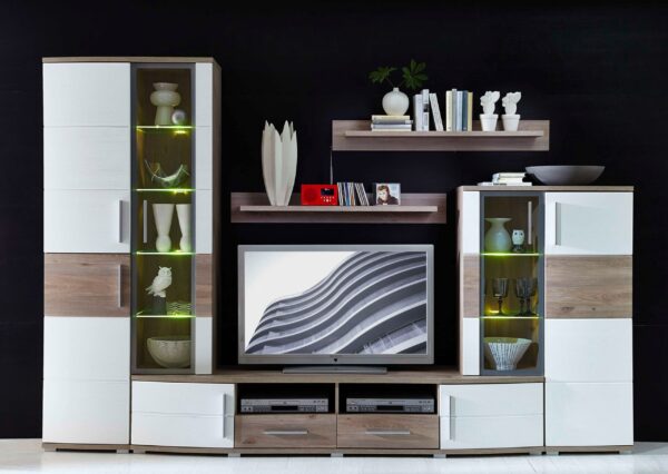Wohnwand JAM 5tlg. Wohnzimmer-Set 300cm Vitrine Wandboard TV Regal weiß Eiche LED